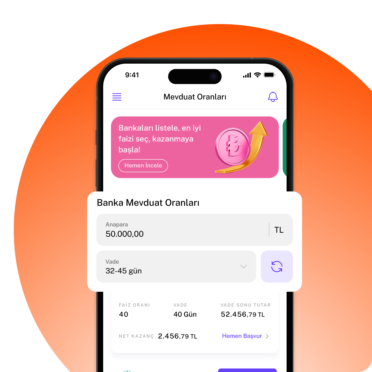 Yatırım tutarınızı girin, vadenizi seçin, bankaların en güncel tekliflerini anında listeleyin. Sizi en yüksek getiriyi sunan bankaya kolayca yönlendirelim!