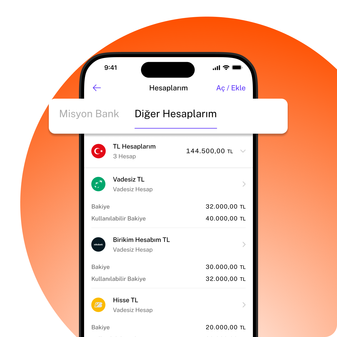 Diğer bankalardaki hesaplarınızı Misyon Bank’a güvenle ekleyerek tüm finansal durumunu tek ekrandan anlık olarak yönetmeye başlayın.